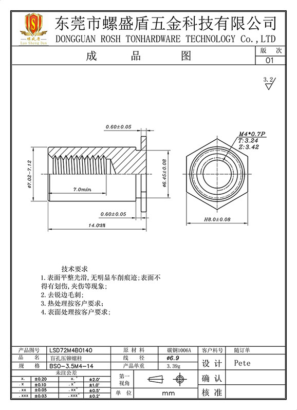 BSO-M4-14 壓鉚螺母柱