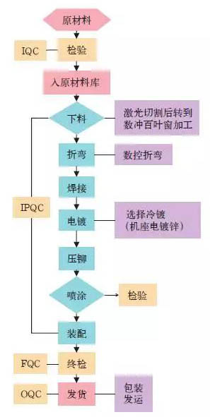 電源箱體的主要工序有下料、折彎、焊接、電鍍、壓鉚、噴涂等工藝,其生產(chǎn)的具體流程如圖2所示,來料檢驗(yàn)即IQC,檢驗(yàn)包括板材、輔料、涂料、外購件、外協(xié)件等物品,若合格則進(jìn)入原材料庫;過程檢驗(yàn)即IPQC,包含首件檢查、巡回抽檢及末件檢查等;完工檢驗(yàn)即FQC,就是按工藝確認(rèn)工序有無錯(cuò)漏等;出貨檢驗(yàn)即OQC,對產(chǎn)品外觀、包裝及數(shù)量等進(jìn)行再確認(rèn)。在焊接、噴涂、裝配及終檢環(huán)節(jié),均需配置標(biāo)準(zhǔn)作業(yè)程序,即SOP,包括各工序的標(biāo)準(zhǔn)操作程序等,以便各項(xiàng)工作都能按體系→流程→標(biāo)準(zhǔn)執(zhí)行,從而實(shí)現(xiàn)精益生產(chǎn),避免浪費(fèi)。