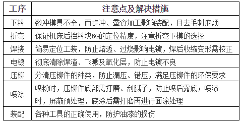 電源機(jī)箱各工序的生產(chǎn)要點(diǎn)及解決措施如圖4所示。需要指出的是,沖孔后攻絲和翻邊攻絲的工藝正逐步被壓鉚螺母 壓鉚螺絲 壓鉚螺母柱等壓鉚工藝所取代,激光在切割壓鉚件的底孔時(shí),由于切割起點(diǎn)與終點(diǎn)接合處存在微小的接點(diǎn),切割尺寸必須加大0.05mm,如壓鉚螺母S—M4—1及壓鉚螺母柱SOO—3.5M3—H的底孔均為Φ5.4mm,激光應(yīng)切割成Φ5.45mm,為保證加工精度,壓鉚件的底孔通常使用數(shù)控沖床或模具加工。