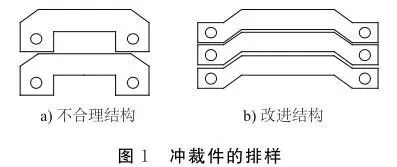 沖裁是利用沖模使板料相互分離的工序。沖裁零件的形狀應(yīng)力求簡單,盡可能采用圓形或矩形等規(guī)則形狀并簡單對稱,以使下料簡便和排樣時廢料最少(見圖1)。