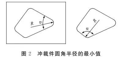 沖裁件的外形和內(nèi)孔的轉(zhuǎn)角處,應(yīng)以圓弧過渡,避免尖角,以便于模具加工,減少熱處理或沖壓時在尖角處開裂的現(xiàn)象;同時也能防止尖角部位刃口的過快磨損。圓弧半徑R的大小可由材料壁厚t決定,當尖角α>90°時,取R≥(0.3~0.5)t;當α<90°時,取R≥(0.6~0.7)t。沖裁件圓角半徑的最小值如圖2所示。
