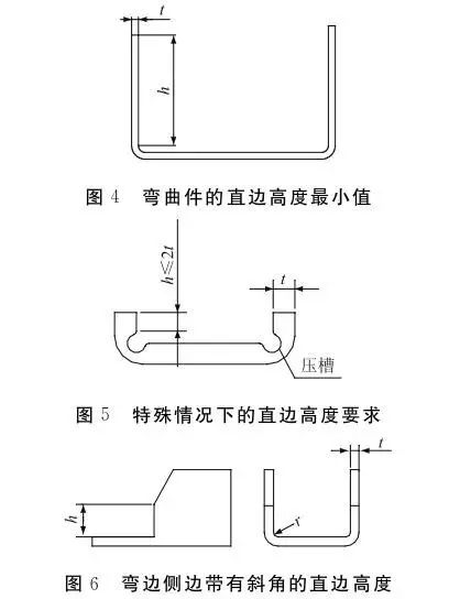 折彎件的直邊高度不宜太小,最小高度h應(yīng)大于2倍的材料厚度t(見圖4)。當零件折彎的直邊高度h≤2t時,可在彎曲變形區(qū)內(nèi)加工淺槽后,再折彎(見圖5)。當折彎件的折彎邊帶有斜角時(見圖6),側(cè)面的最小高度h=(2~4)t,且h>3mm。