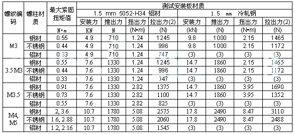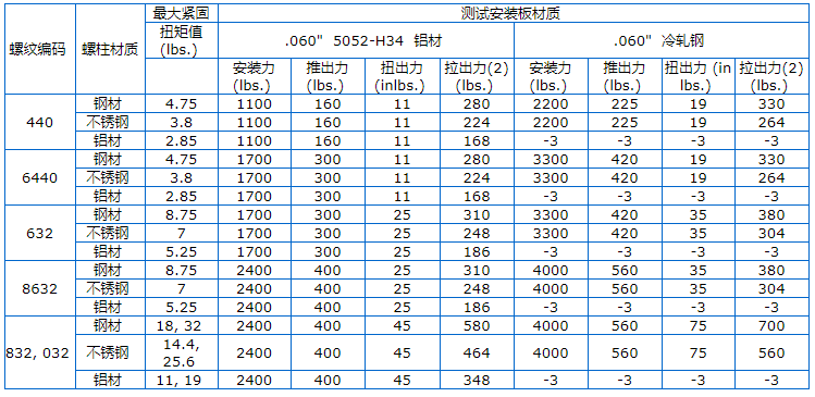 2、 當(dāng)螺柱安裝于厚度低于 .060"/1.5mm 的板材中時,螺柱的拉出力,推出力和扭出力值為上表所列值的80%。