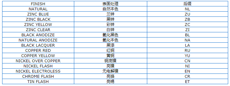 壓鉚螺母,壓鉚螺柱,壓鉚螺釘及其它壓鉚緊固件在其規(guī)格描述中以最后的兩位英文字母代號(hào)作為后綴,該代號(hào)代表表面電鍍的類型,如S-M3-1 ZI中的ZI表示該壓鉚螺母鍍白鋅。