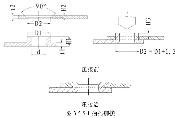 抽孔鉚接是采用其中一個(gè)零件沖孔,另一個(gè)零件沖孔翻邊,通過(guò)鉚接使之成為不可拆卸的連接體。優(yōu)點(diǎn):翻邊與直孔相配合,本身具有定位功能,鉚接強(qiáng)度高,通過(guò)模具鉚接效率也比較高,具體方式如圖3.5.5-1所示: