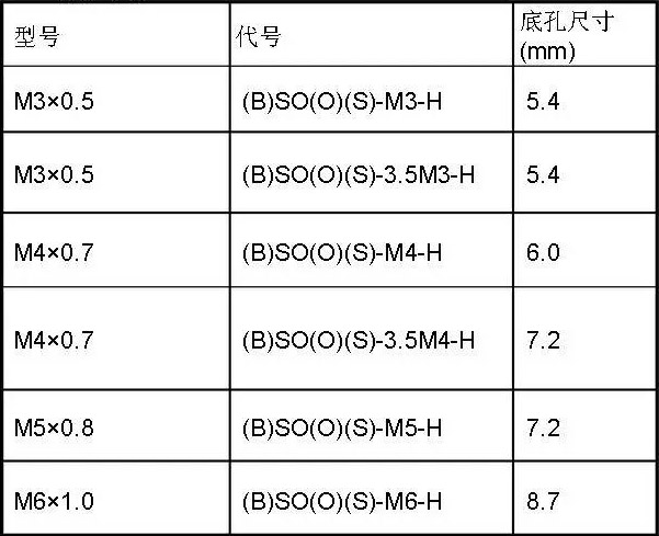 注:SO SOS 為通孔不通牙,SOO SOOS 為通孔通牙,加B為不通孔,加S為不銹鋼材料,H為螺母柱的高度。