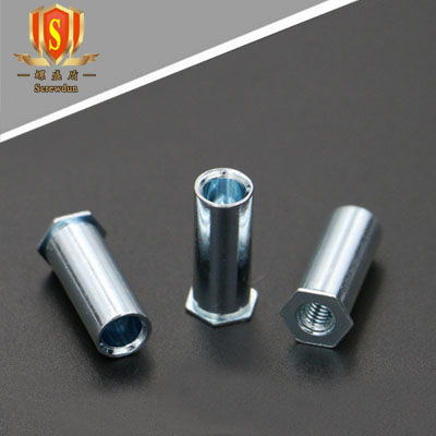 上面這種叫SO(通孔)壓鉚螺柱,當(dāng)然,還有盲孔的,就是六角這一頭是不通的,叫BSO,它長的是這樣的:
