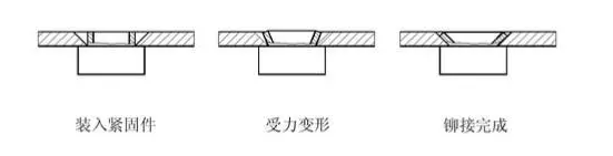 漲鉚就是指在鉚接過(guò)程中,鉚裝螺釘或螺母的部分材料在外力作用下發(fā)生塑性變形,與基體材料形成緊配合,從而實(shí)現(xiàn)兩個(gè)零件的可靠連接的方式。常用的ZRS等等就是采用此種鉚接型式實(shí)現(xiàn)與基材的連接的。漲鉚工藝比較簡(jiǎn)單,連接強(qiáng)度較低,通常用在對(duì)緊固件高度有限制,且承受扭距不大的情況。如圖3所示: