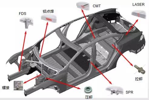 特斯拉Model-S應(yīng)用了鋁點(diǎn)焊、CMT、激光焊、拉鉚、壓鉚、SPR、FDS、螺栓連接、膠結(jié)等工藝,通過這種熱連接技術(shù)與冷連接技術(shù)的組合應(yīng)用,優(yōu)勢互補(bǔ);實(shí)現(xiàn)零件的連接,對控制車身精度及連接強(qiáng)度具有較大意義。