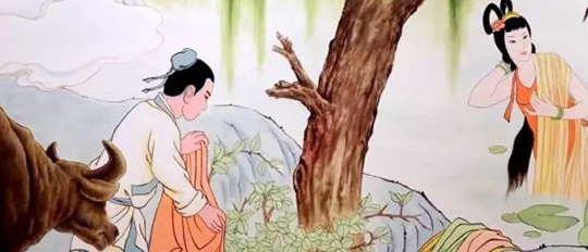 牛郎出身貧寒,年紀(jì)不小了, 還是孑然一身。他有一頭老黃牛,一天,老黃牛對(duì)他說(shuō):“河里有一群姑娘在洗澡,她們把衣服脫在河沿上,有一套白色的衣服,你把它拿走,那件衣服的主人就是你的妻子。”