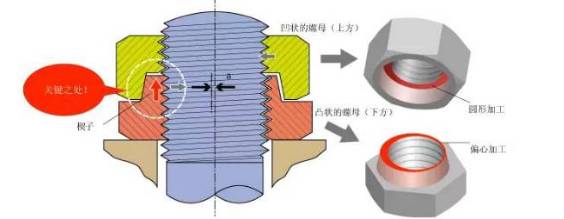 據(jù)說(shuō)發(fā)明人若林克彥介紹說(shuō),這種螺母是這樣做到永不松動(dòng)的,通過(guò)在螺母和螺絲之間揳入楔子來(lái)防止產(chǎn)生松動(dòng)。Hard Lock螺母有兩個(gè)“凹”“凸”狀的螺母組成,下方的螺母呈凸?fàn)?,在加工時(shí)采用中心稍許錯(cuò)動(dòng)的偏心加工,上方的螺母呈凹狀,采用圓形加工,這樣就形成了鞋子的效果,永不松動(dòng)的螺母就問(wèn)世了。
