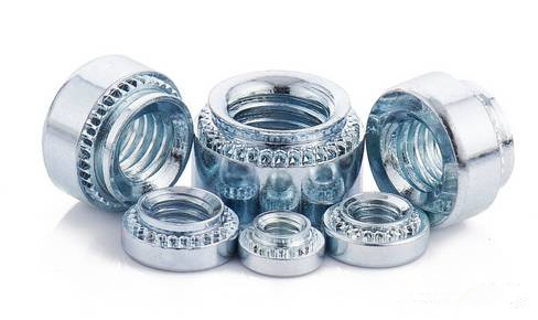 是應(yīng)用于薄板或鈑金上的一種螺母,外形呈圓形,一端帶有壓花齒及導(dǎo)向槽。其原理是通過(guò)壓花齒壓入鈑金的預(yù)置孔位,一般而言預(yù)置孔的孔徑略小于壓鉚螺母的壓花齒,通過(guò)壓力使壓鉚螺母的花齒擠入板內(nèi)使導(dǎo)致孔的的周邊產(chǎn)生塑性變形,變形物被擠入導(dǎo)向槽,從而產(chǎn)生鎖緊的效果。