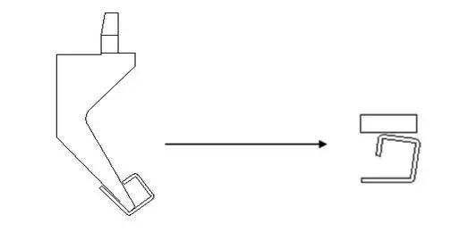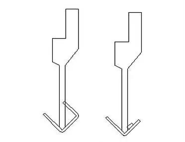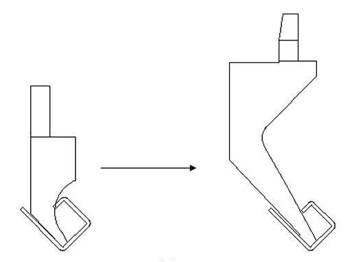 而圖(3)右側(cè)的情況就要選用尖刀來(lái)避位了,但同時(shí)也要注意,由于尖刀的頭很尖,所以它的強(qiáng)度比較差,所以它不能用于厚板的折彎,一般1.5mm以上的板厚都不使用尖刀,而在工藝安排上,再想辦法,例如把壓鉚螺母工藝安排在折彎以后等。見(jiàn)圖(5)